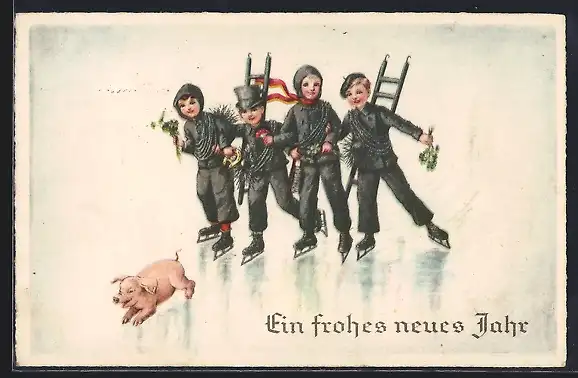 AK Schornsteinfeger mit Leitern auf Schlittschuhen, Neujahrsgruss