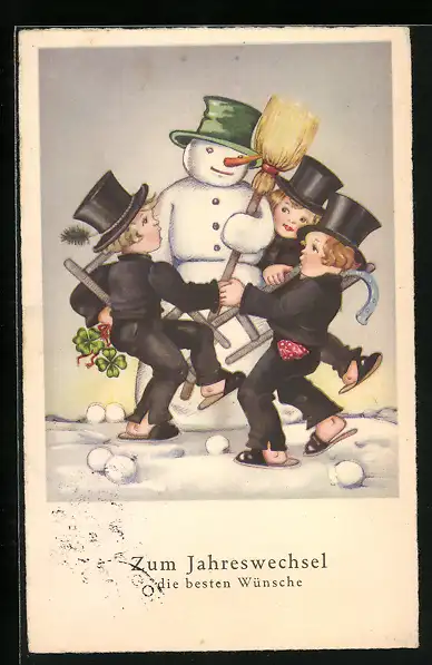 AK Schornsteinfeger tanzen um einen Schneemann, Neujahrsgruss
