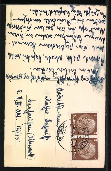 Personenbezogene Daten auf der Rückseite der Karte wurden durch blauen Textmarker unkenntlich gemacht. Die blauen Stellen sind auf die Vorderseite durchgeweicht und wirken sich negativ auf das Postkartenfoto aus