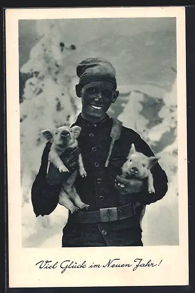 AK Schornsteinfeger trägt Ferkel in den Armen, Neujahrsgruss