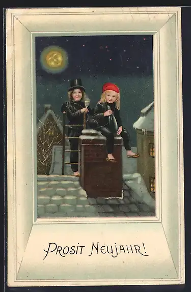 AK Schornsteinfegermädchen sitzen auf dem Dach, Prosit Neujahr