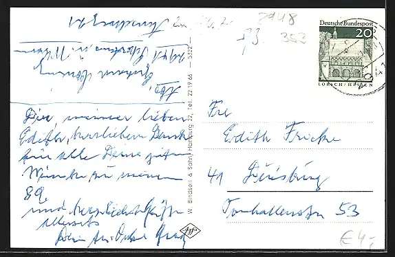 Personenbezogene Daten auf der Rückseite der Karte wurden durch blauen Textmarker unkenntlich gemacht. Die blauen Stellen sind auf die Vorderseite durchgeweicht und wirken sich negativ auf das Postkartenfoto aus