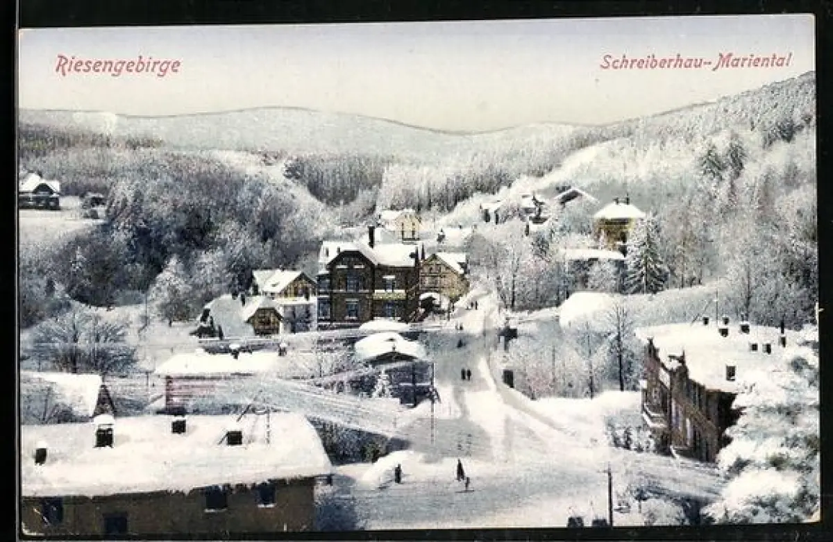 AK Schreiberhau-Mariental, verschneite Ortschaft im Riesengebirge