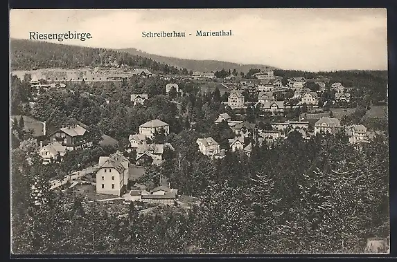AK Schreiberhau-Marienthal, Ortsansicht aus der Vogelschau