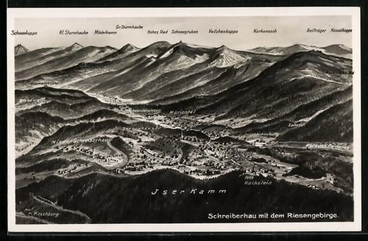 AK Schreiberhau, Ortsansicht mit dem Riesengebirge