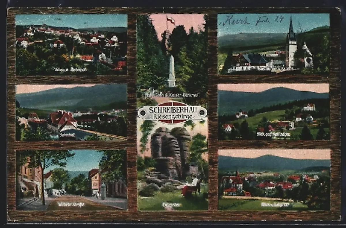 AK Schreiberhau i. Riesengebirge, Villen am Bahnhof, Wilhelmstrasse, Eulenstein, Kaiser-Denkmal, Haus Sunem und Kapelle