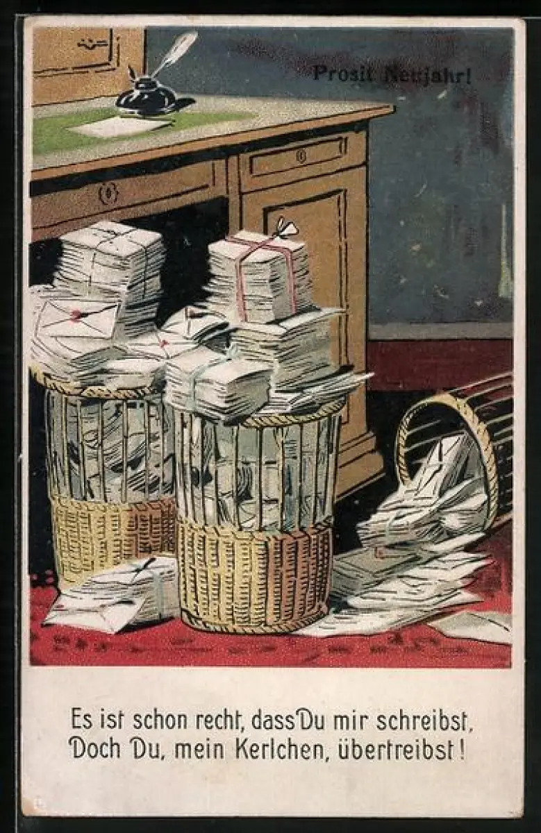 AK Schreibtisch und Körbe voller Briefe, Neujahrsgruss