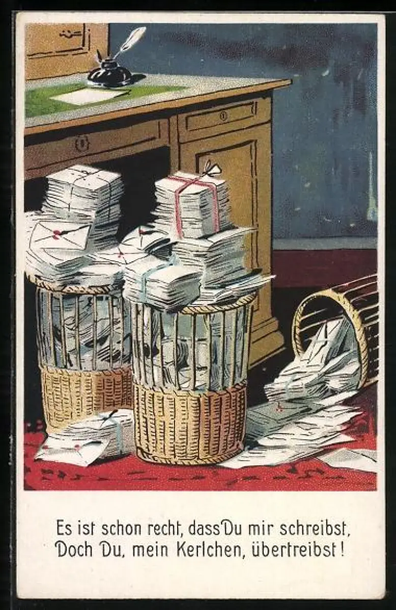 AK Schreibtisch und Körbe voller Briefe, Neujahrsgruss