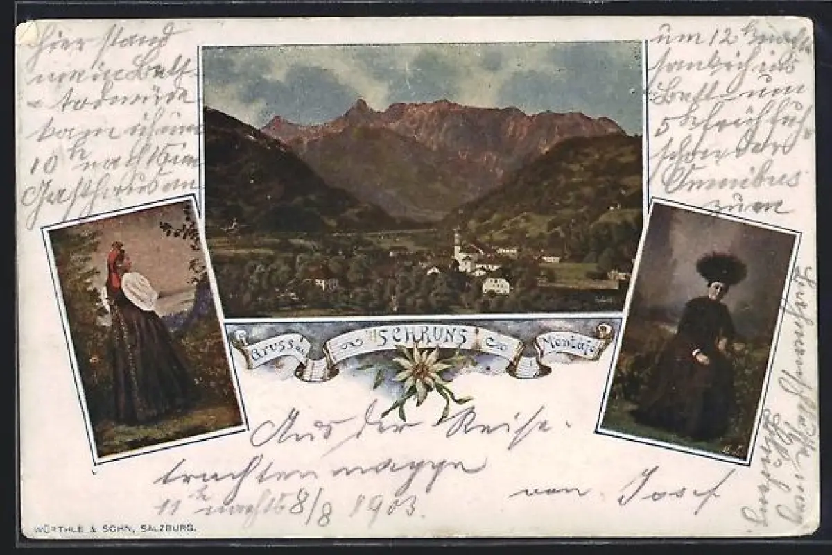 AK Schruns /Montafon, Teilansicht des Ortes und zwei Frauen Trachten