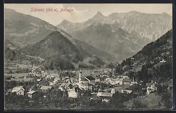 AK Schruns /Montafon, Totalansicht mit Bergspitzen aus der Vogelschau
