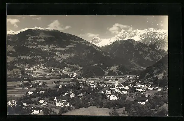 AK Schruns, Ortsansicht mit Zimba aus der Vogelschau
