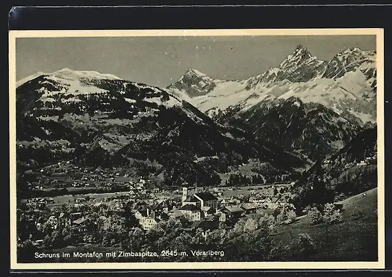 AK Schruns im Montafon, Ortsansicht mit Zimbaspitze aus der Vogelschau