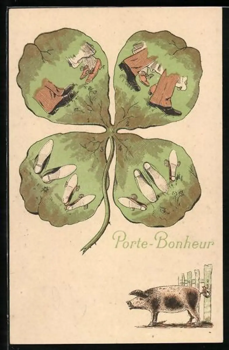 AK Schuhe auf einem Kleeblatt, Schwein am Zaun, Erotik