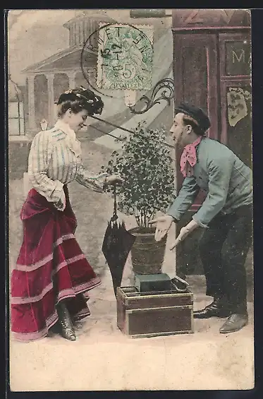 AK Schuhputzer bietet einer Dame seine Dienste an