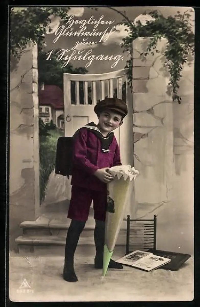 AK Schulanfang, Junge mit Ranzen und Schultüte, daneben Rechenschieber
