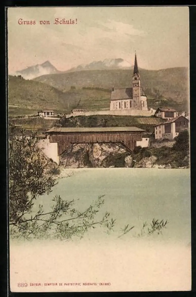 AK Schuls, Kirchpartie mit Alpenpanorama