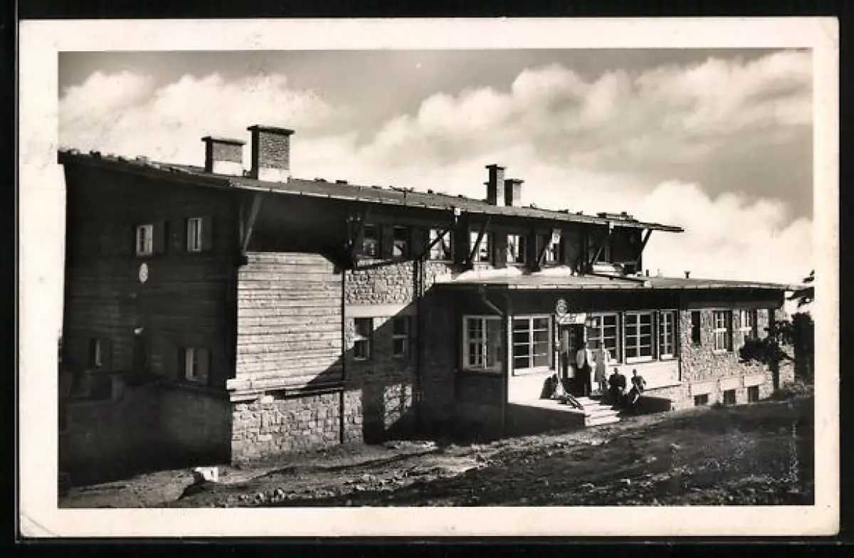 AK Schutzhütte KTT am Kahlenberg, Besucher vor dem Eingang