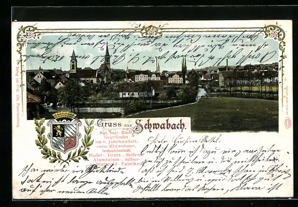 AK Schwabach, Teilansicht mit Kirche, Wappen