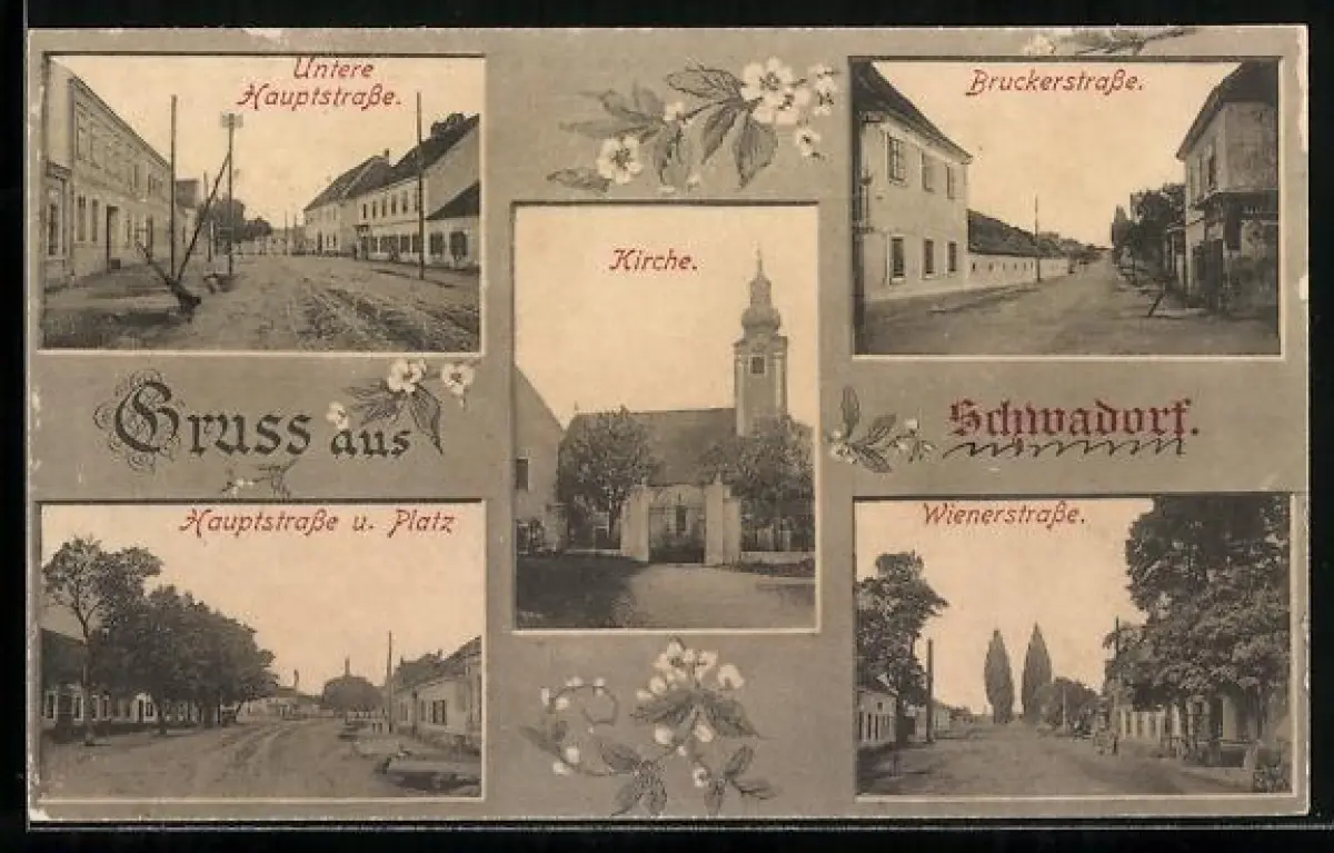 AK Schwadorf, Untere Hauptstrasse, Bruckerstrasse, Wienerstrasse und Kirche