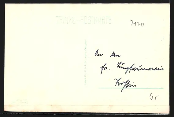 Personenbezogene Daten auf der Rückseite der Karte wurden durch blauen Textmarker unkenntlich gemacht. Die blauen Stellen sind auf die Vorderseite durchgeweicht und wirken sich negativ auf das Postkartenfoto aus
