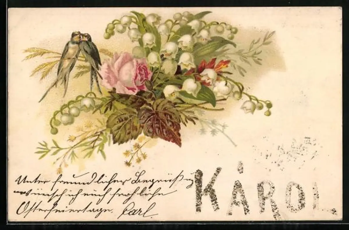 AK Schwalbenpaar neben Maiglöckchenstrauss