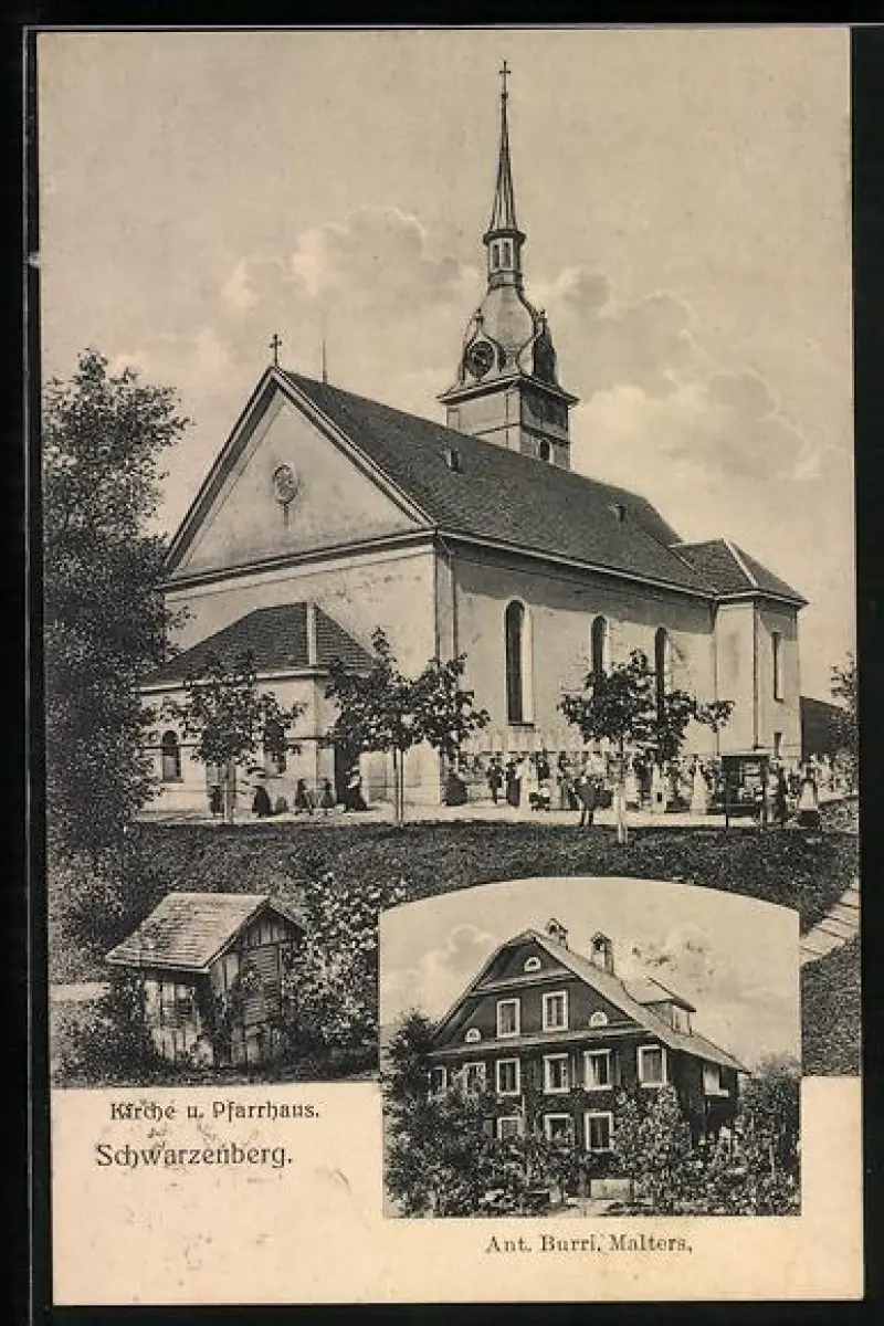 AK Schwarzenberg, Gebäudeansicht, Kirche und Pfarrhaus