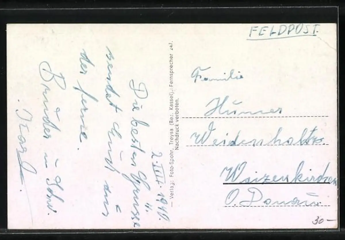 Personenbezogene Daten auf der Rückseite der Karte wurden durch blauen Textmarker unkenntlich gemacht. Die blauen Stellen sind auf die Vorderseite durchgeweicht und wirken sich negativ auf das Postkartenfoto aus