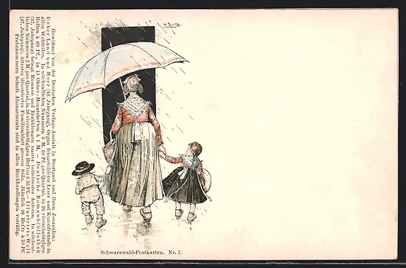 AK Schwarzwald-Postkarten No. 7, Mutter und Kinder mit Regenschirm, Tracht