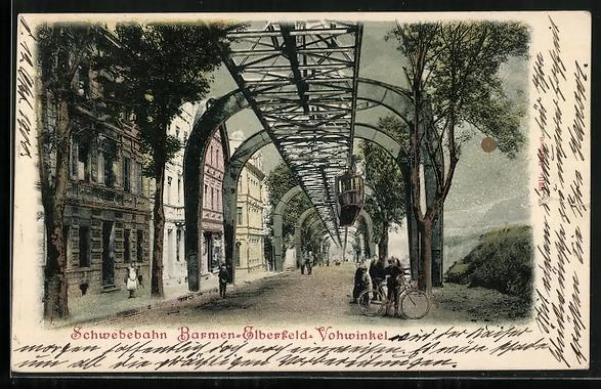 AK Schwebebahn Barmen-Elberfeld-Vohwinkel, Partie mit Radfahrer