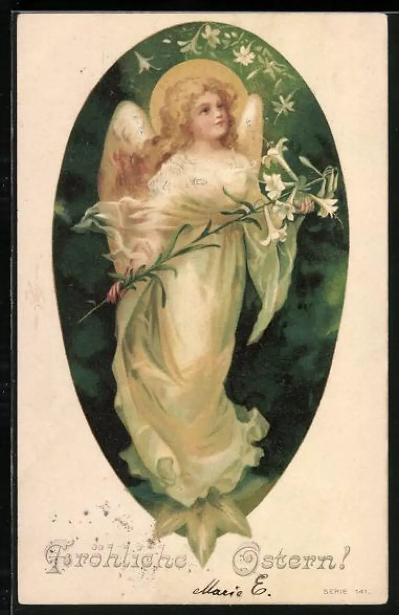 AK Schwebender Osterengel mit weisser Lilie in den Händen