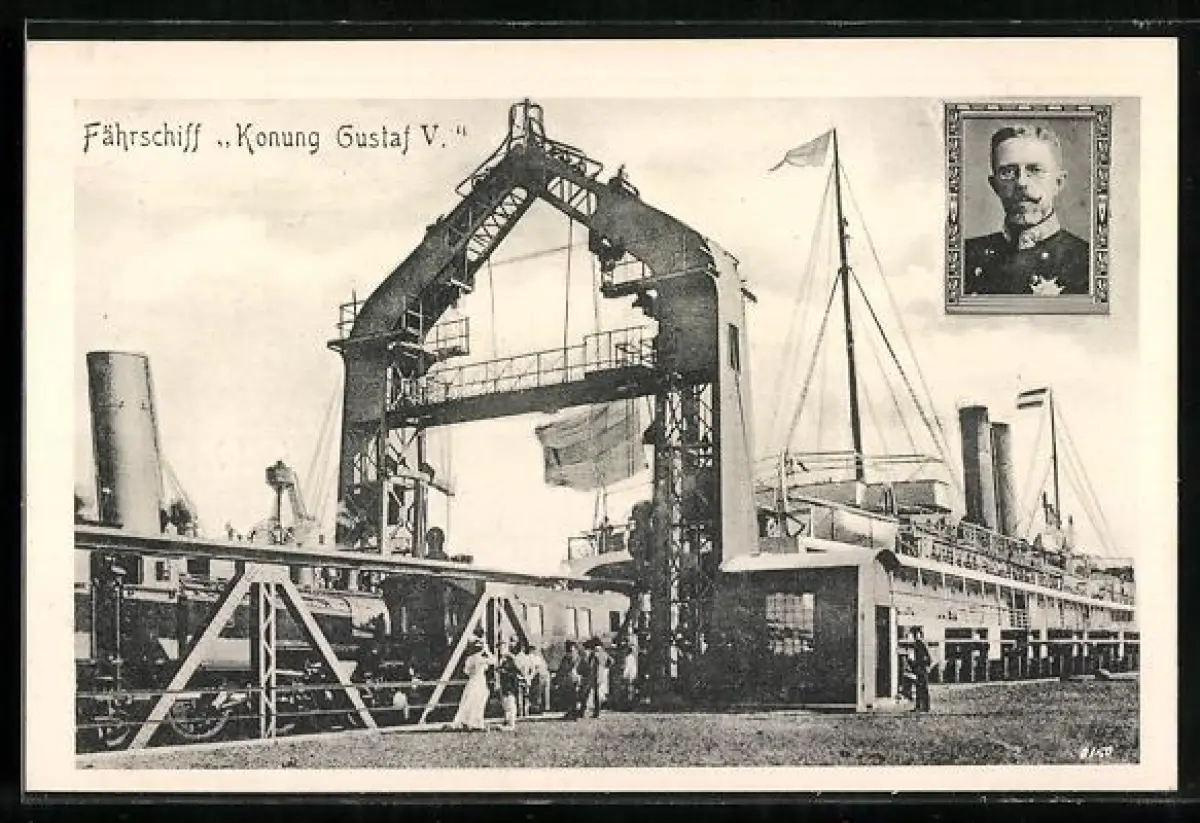 AK Schwedisches Eisenbahn-Fährschiff Konung Gustaf V, einfahrender Zug