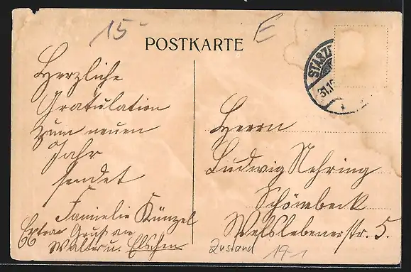 Personenbezogene Daten auf der Rückseite der Karte wurden durch blauen Textmarker unkenntlich gemacht. Die blauen Stellen sind auf die Vorderseite durchgeweicht und wirken sich negativ auf das Postkartenfoto aus