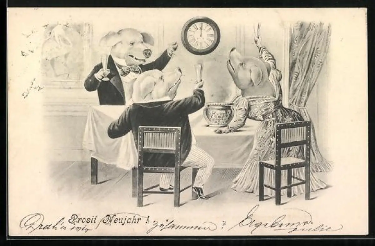 AK Schweine in eleganter Abendgarderobe stossen um Mitternacht mit Sekt an, Prosit Neujahr, vermenschlichte Tiere