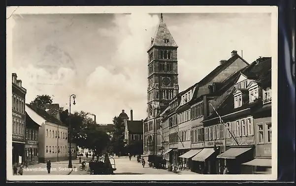 AK Schweinfurt, Am Steinweg, Strassenpartie mit Turm