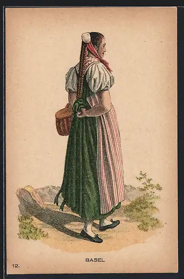 AK Schweiz, Anciens Costumes Suisses, Frau in Tracht mit einem Korb aus Basel
