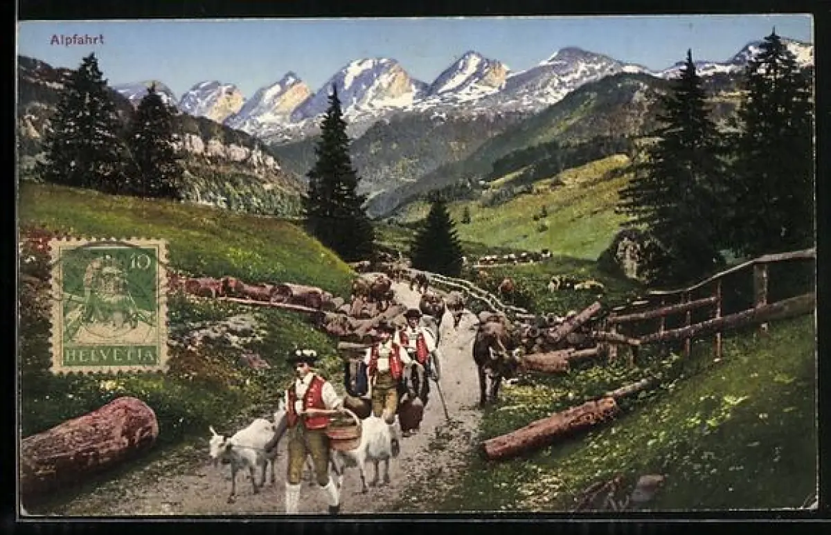 AK Schweiz, Bauern mit Ziegen und Kühen bei der Alpfahrt