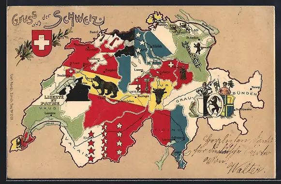 AK Schweiz, Landkarte mit allen Kantonen und Wappen, Um 1900
