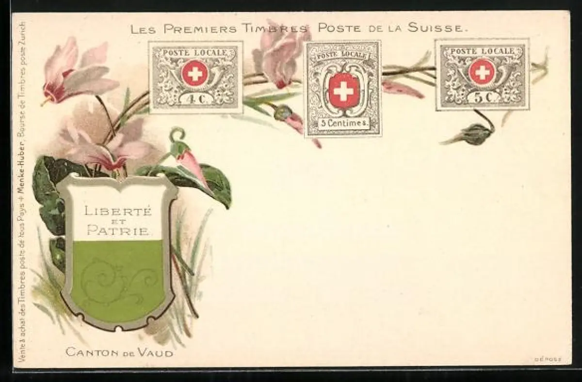 AK Schweiz, Les Premiers Timbres Poste de la Suisse, erste Briefmarken der Schweiz, mit Wappen