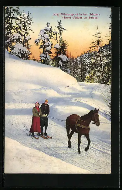 AK Schweiz, Paar auf Skiern lässt sich von einem Pferd ziehen