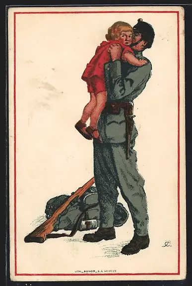 AK Schweizer Soldat liebkost seine kleiner Tochter