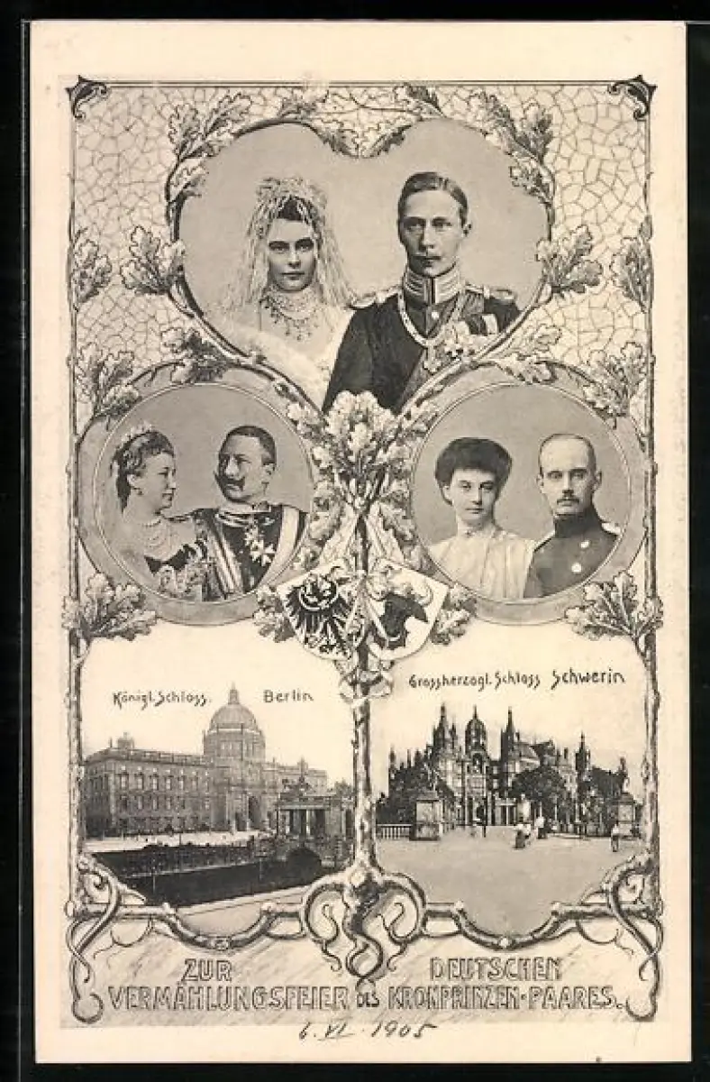 AK Schwerin, Vermählungsfeier des deutschen Kronprinzen-Paares, Grosshzrgl. Schloss Schwerin und Kgl. Schloss Berlin