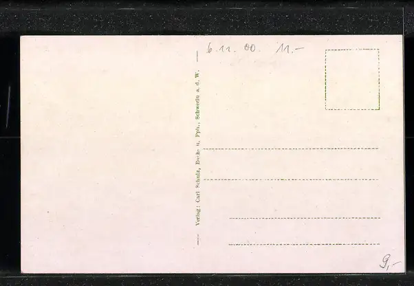 Personenbezogene Daten auf der Rückseite der Karte wurden durch blauen Textmarker unkenntlich gemacht. Die blauen Stellen sind auf die Vorderseite durchgeweicht und wirken sich negativ auf das Postkartenfoto aus