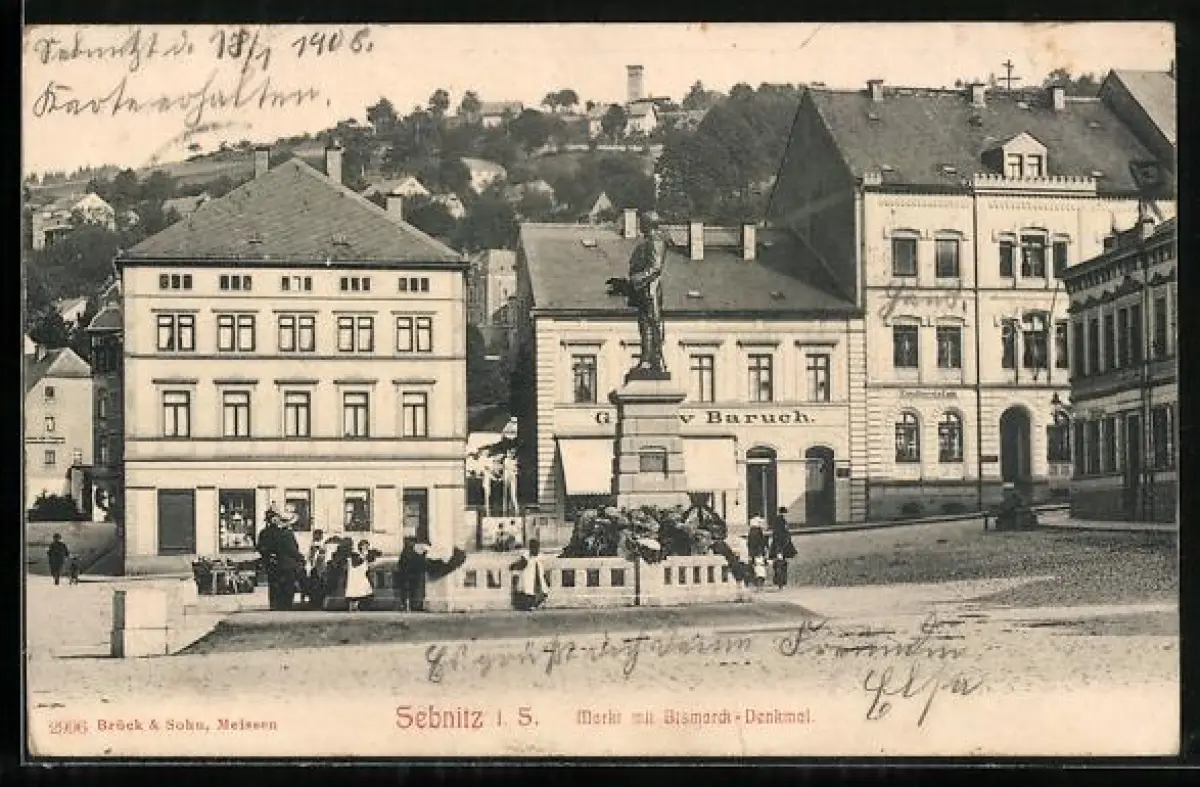 AK Sebnitz i. S., Markt mit Bismarck-Denkmal