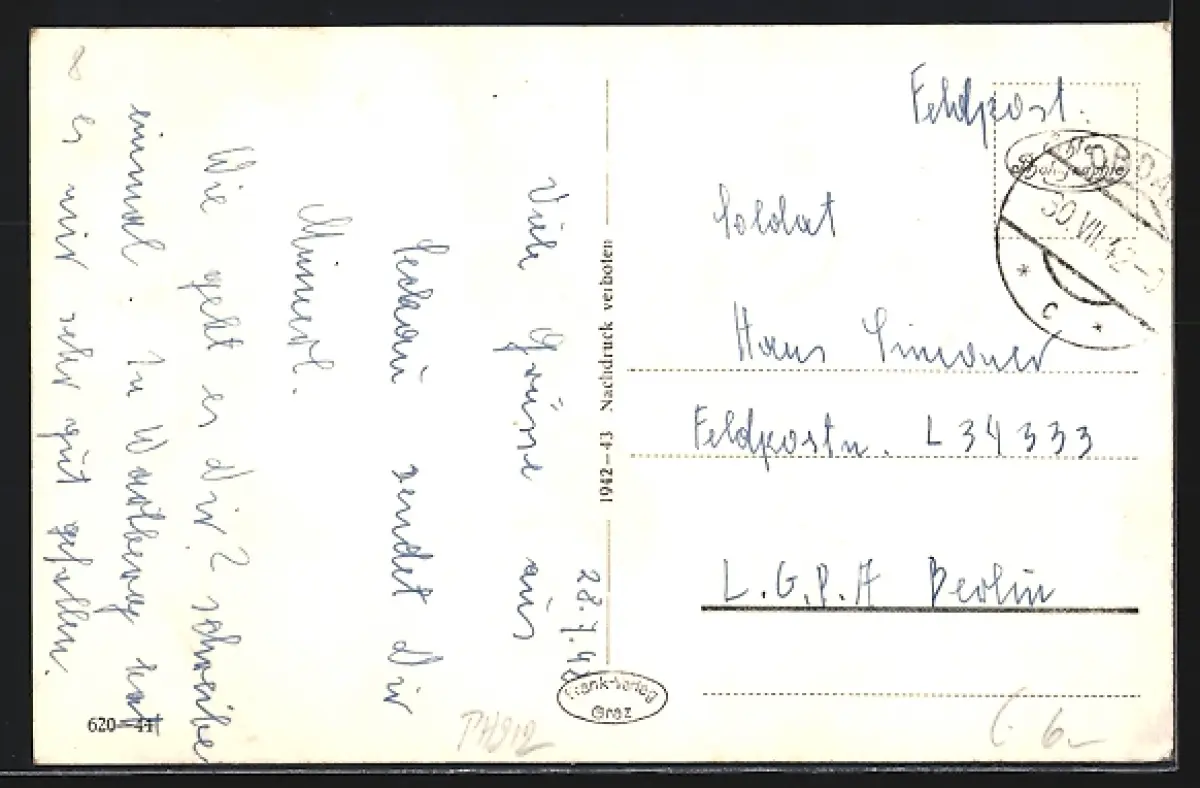 alte Ansichtskarte, gelaufen 1942 als Feldpost, Stempelspur, guter Zustand