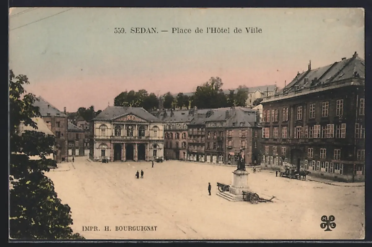 AK Sedan, Place de l`Hôtel de Ville avec statue et bâtiments historiques