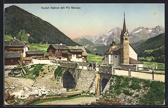 AK Sedrun, Teilansicht mit Kirche, Blick zum Piz Muraun