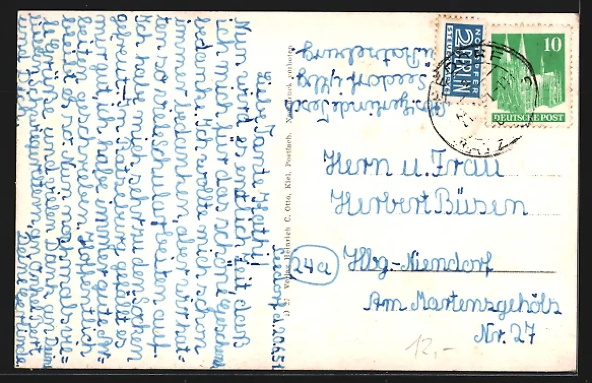 Personenbezogene Daten auf der Rückseite der Karte wurden durch blauen Textmarker unkenntlich gemacht. Die blauen Stellen sind auf die Vorderseite durchgeweicht und wirken sich negativ auf das Postkartenfoto aus
