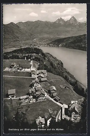 AK Seelisberg, Gesamtansicht mit Brunnen und Mythen aus der Vogelschau