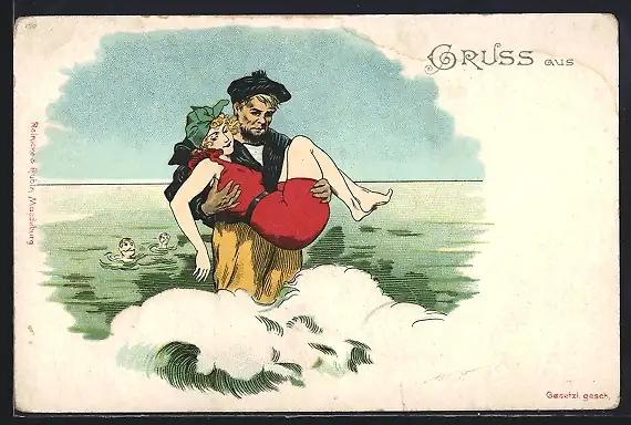 AK Seemann trägt Dame im Badeanzug in den Armen