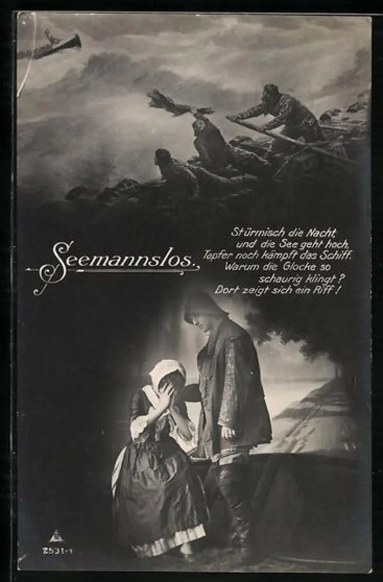 AK Seemannslos, Seemannsfrau trauert, Ruderboot im Sturm, Seenotrettung